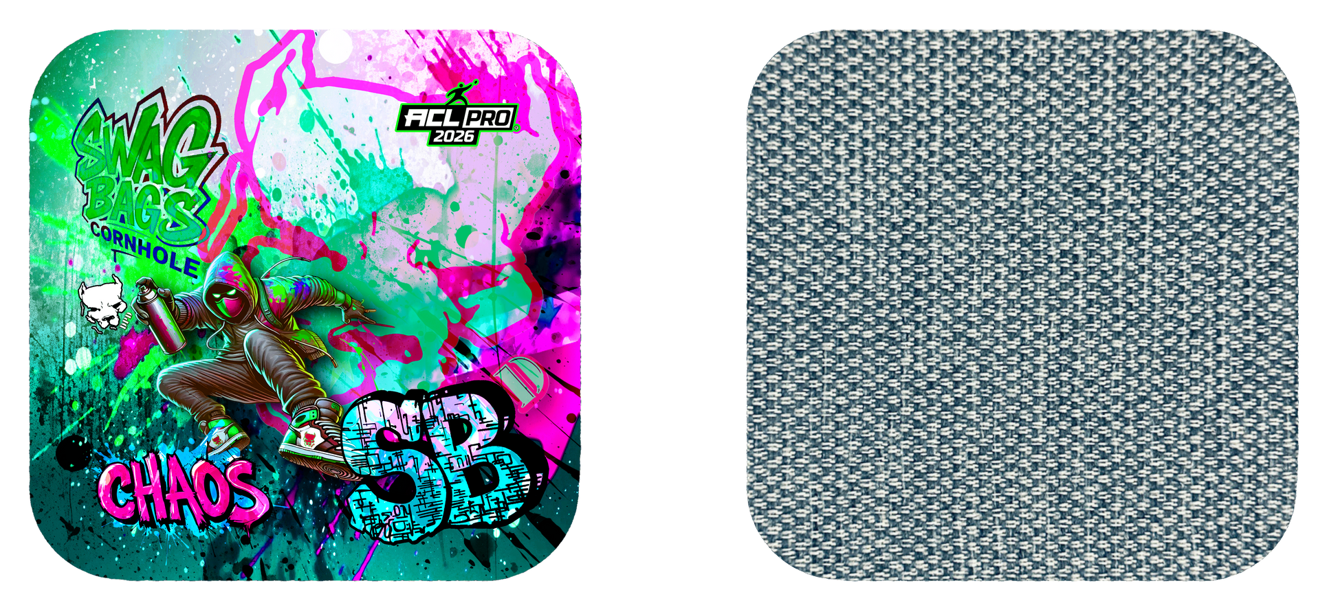Our Chaos series is engineered to fit nearly any throwing style. The hybrid carpet on the slow side plays at a 5 speed. This carpet slides true with little kick, yet the medium fill in the bag allows it to still roll and cut. The slow side has enough speed for normal slide shots, and can still be used to collect and push bags by harder throwers. This material handles humidity very well, and the performance liner maximizes "drip".