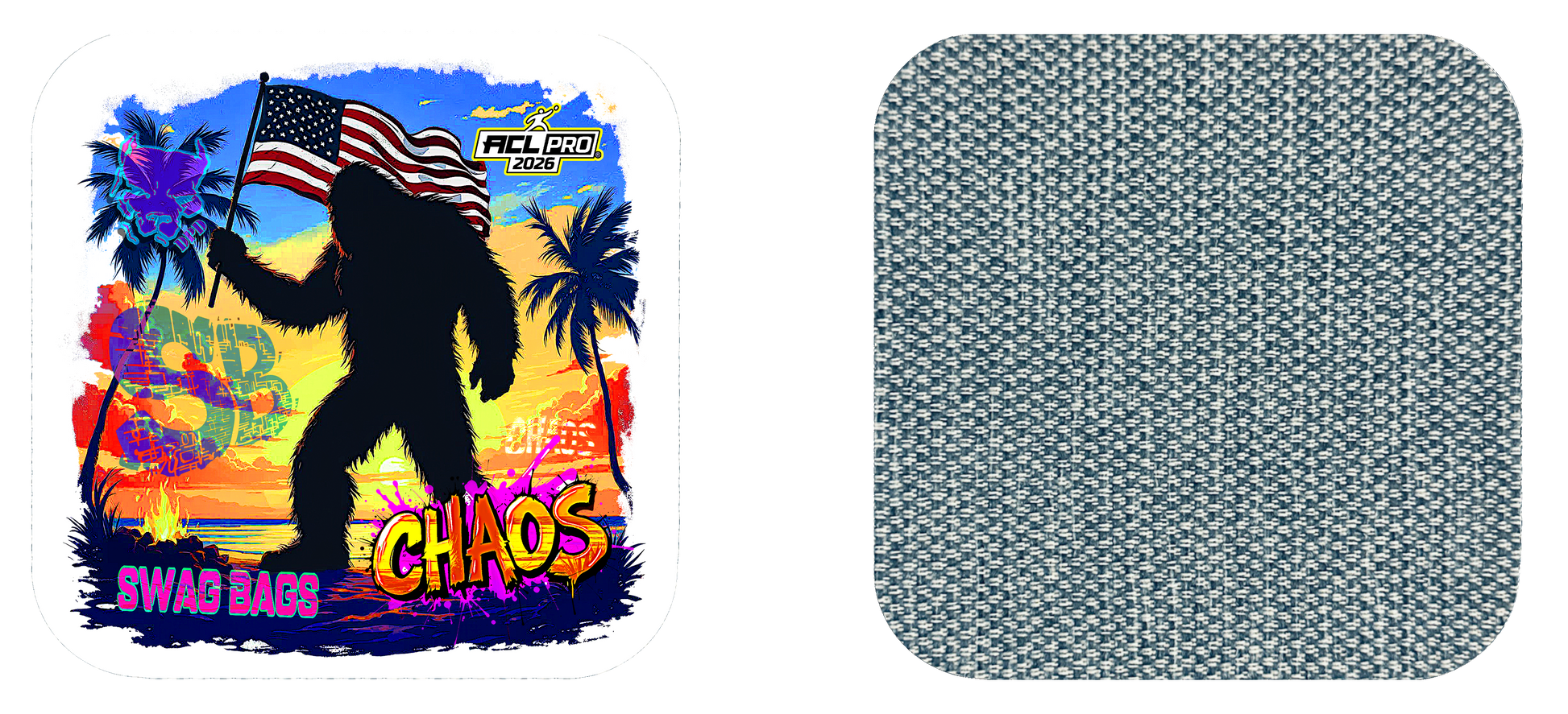 Our Chaos series is engineered to fit nearly any throwing style. The hybrid carpet on the slow side plays at a 5 speed. This carpet slides true with little kick, yet the medium fill in the bag allows it to still roll and cut. The slow side has enough speed for normal slide shots, and can still be used to collect and push bags by harder throwers. This material handles humidity very well, and the performance liner maximizes "drip".